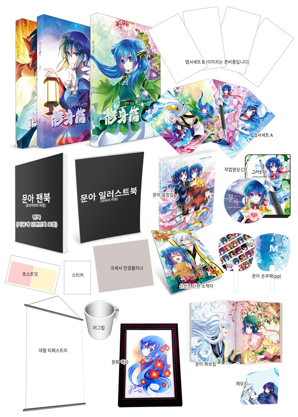 * 한정판B(200,000원): 단행본을 처음 구매하는 분 (20명 한정). 특별판B의 모든 특전 + 머그컵 + 대형 타페스트리 + 원화 액자 + 문아 화보집 + 메모지