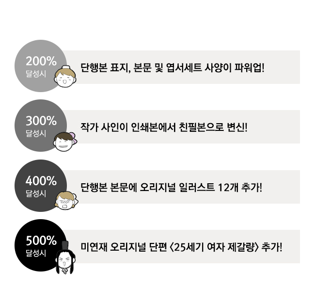 미연재 오리지널 단편의 경우 이미 제작되어 있을 가능성이 높습니다. 하지만 리워드 또는 기본 상품으로 추가한 것이 아닌 '달성 목표'를 제공하여 독자들로 하여금 구매 및 입소문 마케팅을 동시해 진행할 수 있는 방법으로 진행하였습니다.