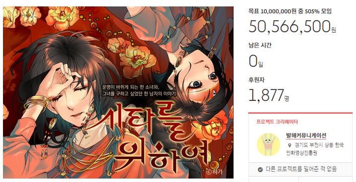 이것은 바로 현재 단행본 판매로 큰 이슈가 되었던 그리고 기록을 보유하고 있는 '시타를 위히여' 목표 달성률 '505%'를 염두해 둔 것으로 풀이됩니다. 500%를 넘길 경우 그리고 505%를 넘길 경우 또 다른 '이슈'를 만들 수 있기 때문입니다. 이런 기획들은 단기적으로 나올 수 없다는 것입니다. 이는 결국 많은 고민과 준비에서 나오는 것으로 그만큼 레진코믹스에서 치밀하게 그리고 오랫동안 준비하였다는 것을 알 수 있습니다.