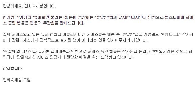 '좋알람'의 디자인과 유사한 앱아이콘과 명칭으로 서비스 중인 앱들은 작가님의 동의가 선행되지 않은 것으로 파악되어, 만화속세상 서비스 담당자가 원만한 해결을 위해 노력하고 있습니다.