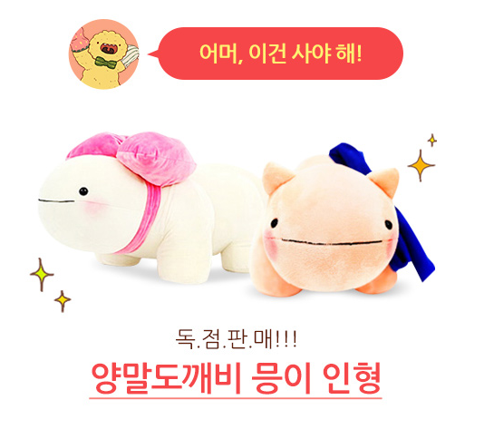 연일 매진 사태로 많은 사랑을 받고 있는 '양말도깨비'의 믕이 인형를 독점판매하니다. 이와 함께 '웹툰 컬러링북', '한정판 단행보 패키지', '양말도깨비 휴대폰 케이스' 그리고 '양말도깨비 쿠션 DIY KIT'등을 판매합니다.