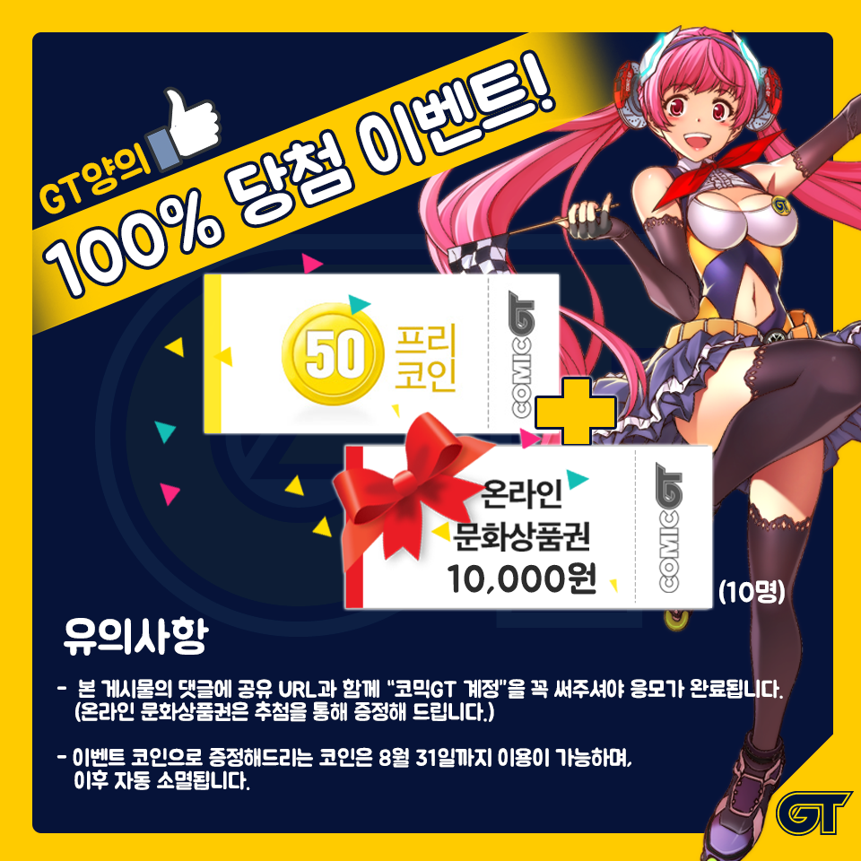 코믹GT 페이스북 페이지에서 '좋아요'를 눌러 주신 모든 분들께 '50 프리코인'과 함께 10분을 추첨하여 '1만원 온라인 문화상품권'을 드립니다.