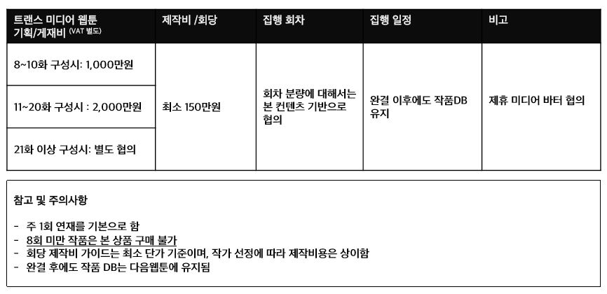 * 트랜스 미디어 웹툰 기획/게재비 (VAT 별도)