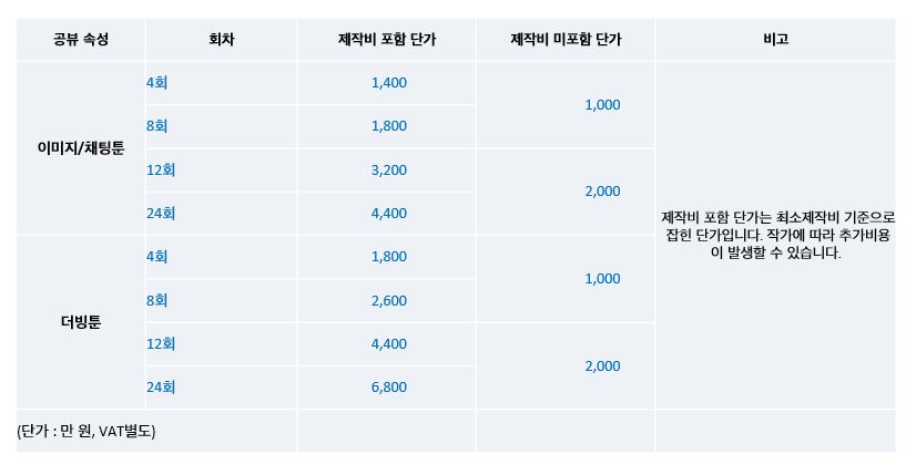 - 분량에 따라 기획 및 입점 비용이 상이하며, 작가군에 따라 제작비도 별도 집행