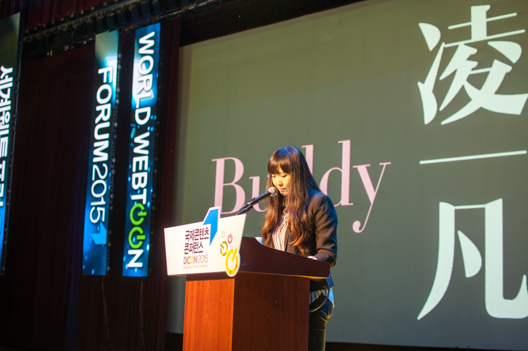 세계웹툰포럼의 첫 포문을 연 기조강연의 연사로 무대에 선 Buddy 작가는 작고 여려 보이는 체구지만 놀랄 만큼이나 힘 있고 또렷한 목소리와 유창한 영어로 강한 인상을 남겼다. 그녀는 처음부터 끝까지 영어로 발표했는데, 영어 구사력은 상당한 수준이었다. 또 강연 중에 사용한 프레젠테이션도 잘 만들어졌고, 그녀의 발표와 너무나 짜임새 있게 맞아들어 청중들을 기분 좋게 했다. 예사롭지 않다 싶었는데, 발표 말미에 남편의 도움을 받았다고 했다. 그녀의 남편은 프레젠테이션의 스페셜리스트라고 밝혔다.