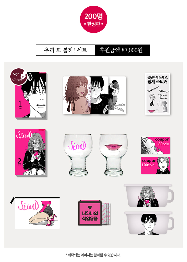* 69,000원 (맥주 한 잔? 세트) : (막차 타고 가! 세트) + 너와 나의 책임용품 세트(콘돔 3pcs) + 기억을 지우는 술잔 세트(2pcs) + 레진코믹스 쿠폰 1매(100 코인)