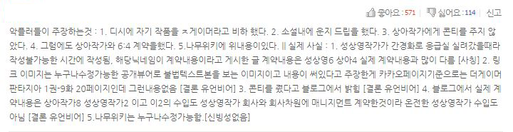 하지만 성상영 작가님의 공개 글 이후로 관련 내용은 수그러들지 못할 것을 보입니다. 관련 회차 댓글들을 통해 타 커뮤니티에서 거론된 내용과 함께 '루머'로 치부하는 것에 대한 반감의 댓글이 등록되고 있습니다. (이 댓글에 대한 반박 댓글 또한 등록되고 있습니다.)