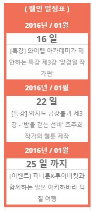 웹툰인사이트에서는 웹툰 관련 강좌, 특강, 행사, 공모전등 모든 일정들을 한 곳에서 확인 하실 수 있는 '웹인 일정표' 서비스를 공개합니다. 웹인 일정표에서는 앞으로 진행되는 다양한 일정들을 한눈에 파악하실 수 있도록 서비스가 제공될 예정입니다.