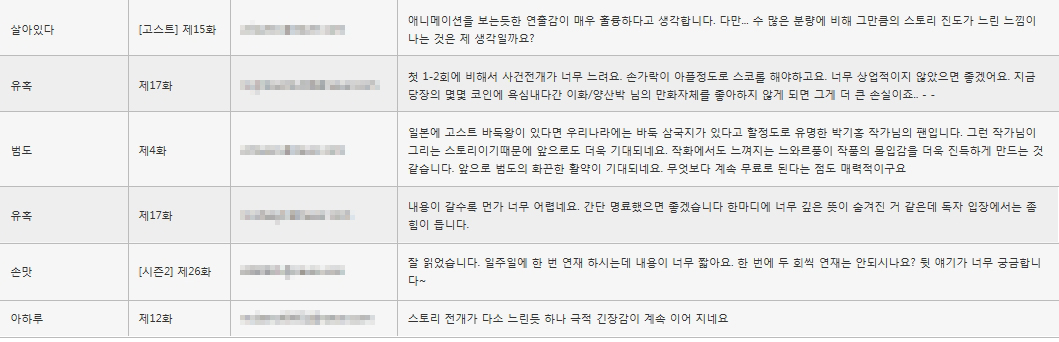 [ 탑툰에서 공개한 수집된 회차 의견 목록 화면 ]