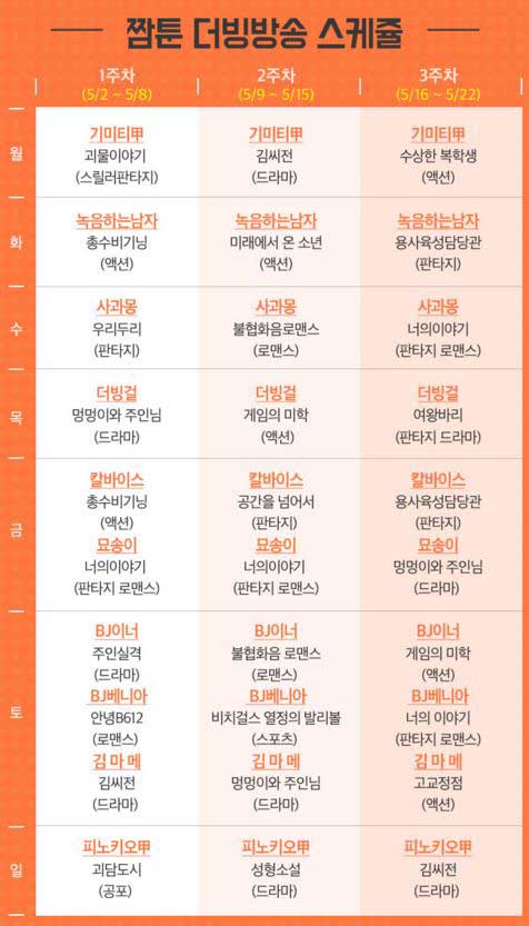 짬툰에서는 1주년을 기념하여 아프리카TV와 손잡고 '더빙툰'을 진행합니다. '더빙툰'은 짬툰에서 연재 중인 인기 웹툰들을 아프리카TV에서 활동하는 김마메, 기미티, 사과몽등 인기 BJ들이 더빙 형식으로 읽어주는 형식으로 진행됩니다. 5월 2일부터 5월 20일까지 3주간 매일 밤 10시 진행됩니다.