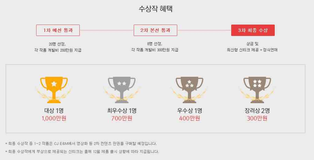 - 최종 수상작 중 1~2작품은 CJ E&M에서 영상화등 2차 컨텐츠 판권을 구매할 예정입니다.